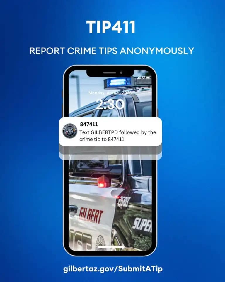 tip411 is a secure and anonymous platform that allows you to send important information about potential criminal activity directly to the Gilbert Police Department.